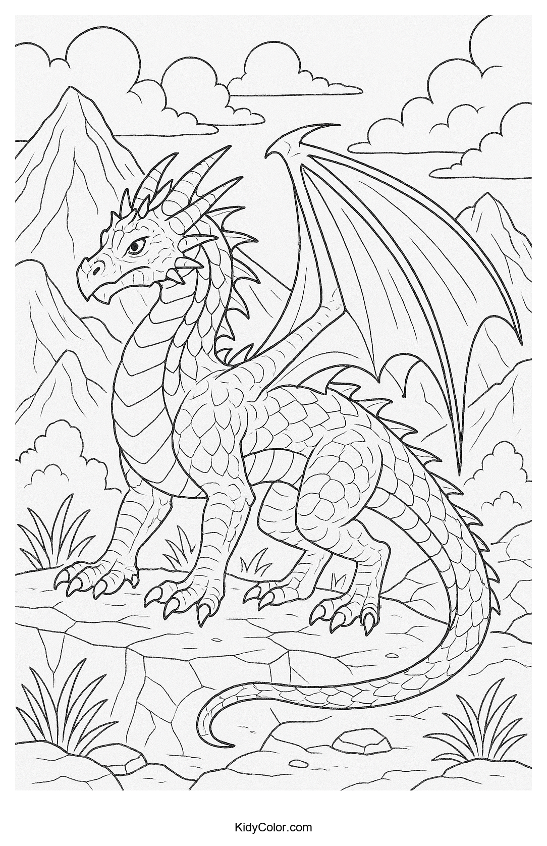 Discover a world of imagination with our Majestic Dragon in a Rocky Landscape coloring page. Perfect for little adventurers, this intricate scene invites kids to unleash their creativity as they bring this mighty dragon and its rugged habitat to life with vibrant colors.