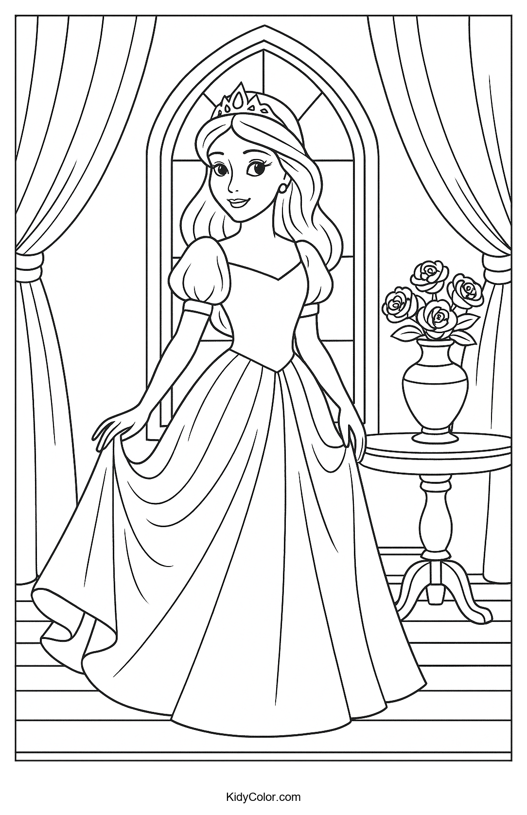 Delight your child's creativity with this enchanting coloring page of a princess standing by an arched window. Perfect for young artists who love fairytales, this scene encourages the exploration of colors and imagination.