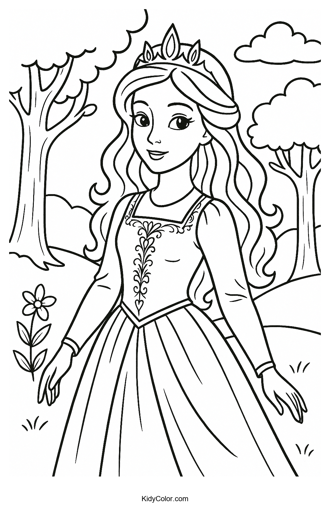 Delight your child's imagination with our Princess in Nature coloring page, featuring a graceful princess surrounded by enchanting flowers and lush greenery. Perfect for sparking creativity and storytelling while they bring this charming scene to life with color.