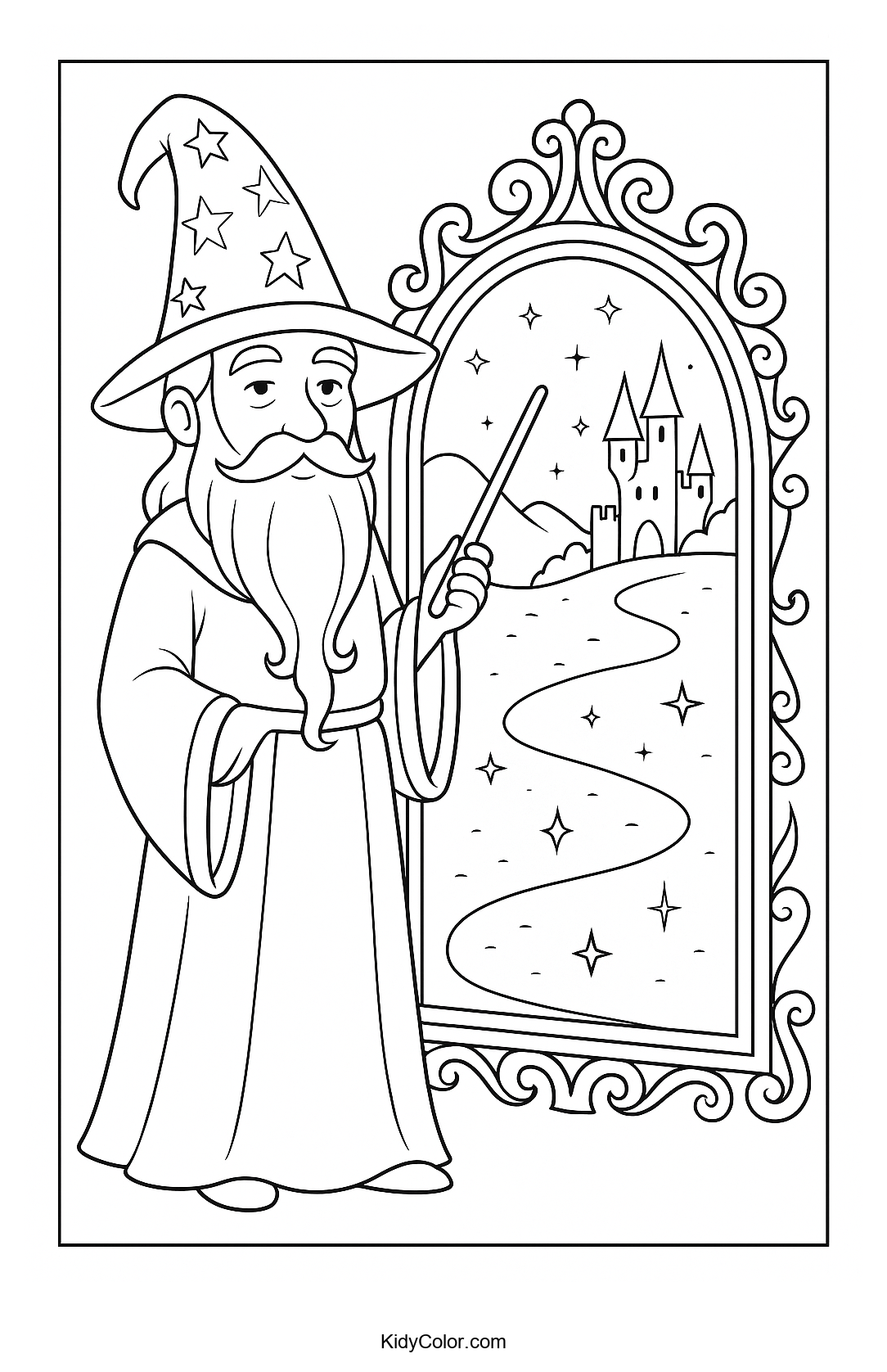 Explore the magical world of wizards with this enchanting coloring page featuring a wizard and a captivating mirror of magic. Perfect for encouraging creativity and storytelling, let your child's imagination soar as they bring this scene to life with color.