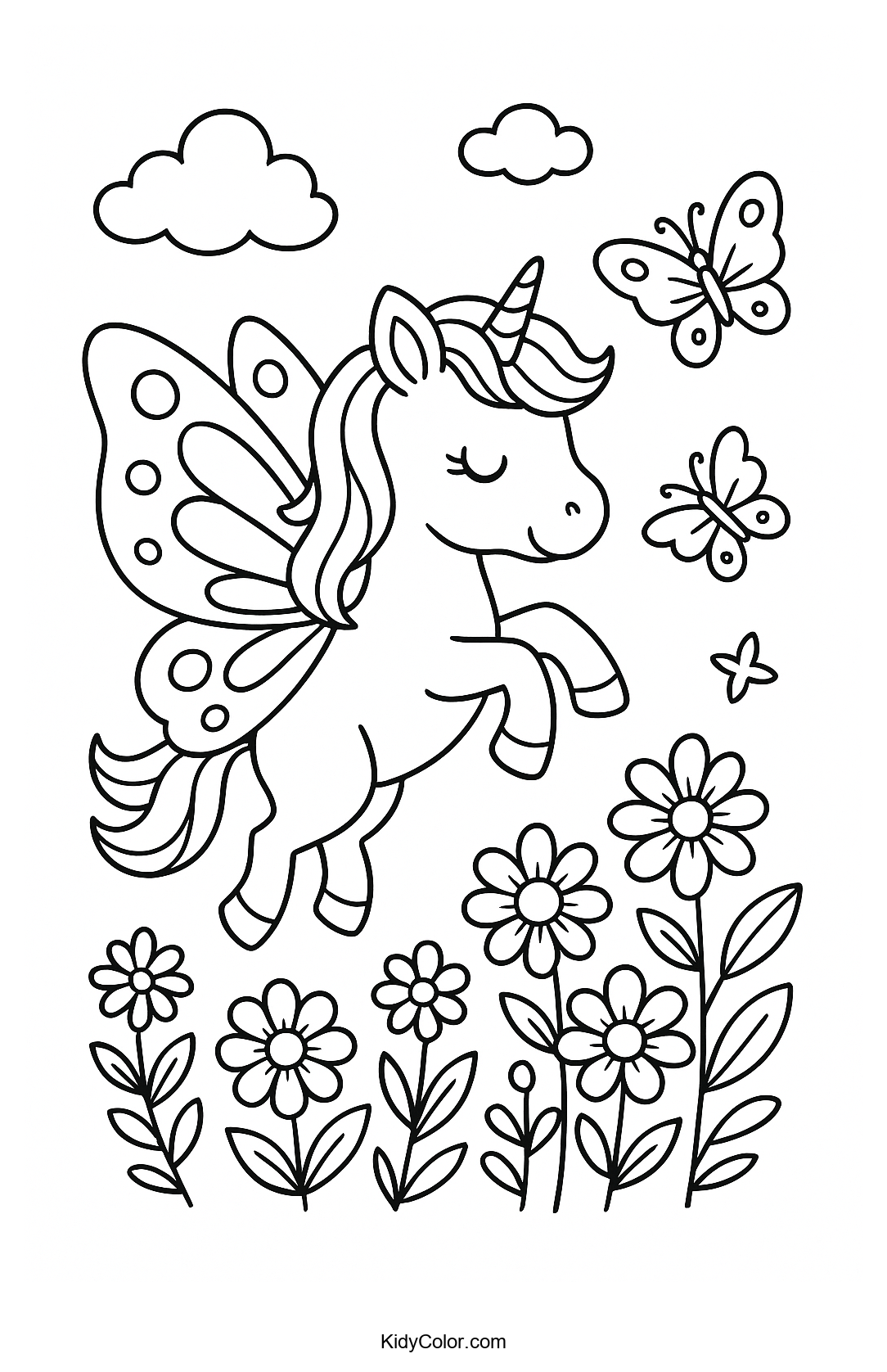 Delight your child's creativity with this enchanting unicorn coloring page featuring a unicorn in flight with vibrant butterfly wings. This coloring sheet is perfect for budding artists to explore colors and imagination in a whimsical, magical scene.