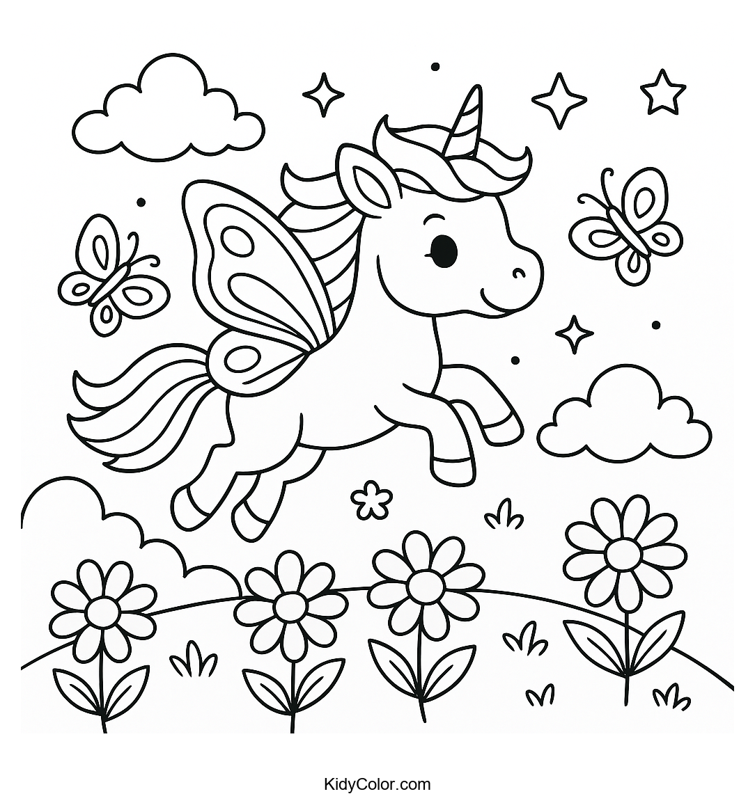 Delight your child's creative senses with this enchanting unicorn with wings in a meadow. This coloring page promises hours of fun, encouraging kids to explore their imagination and choose vibrant colors for a magical unicorn adventure.