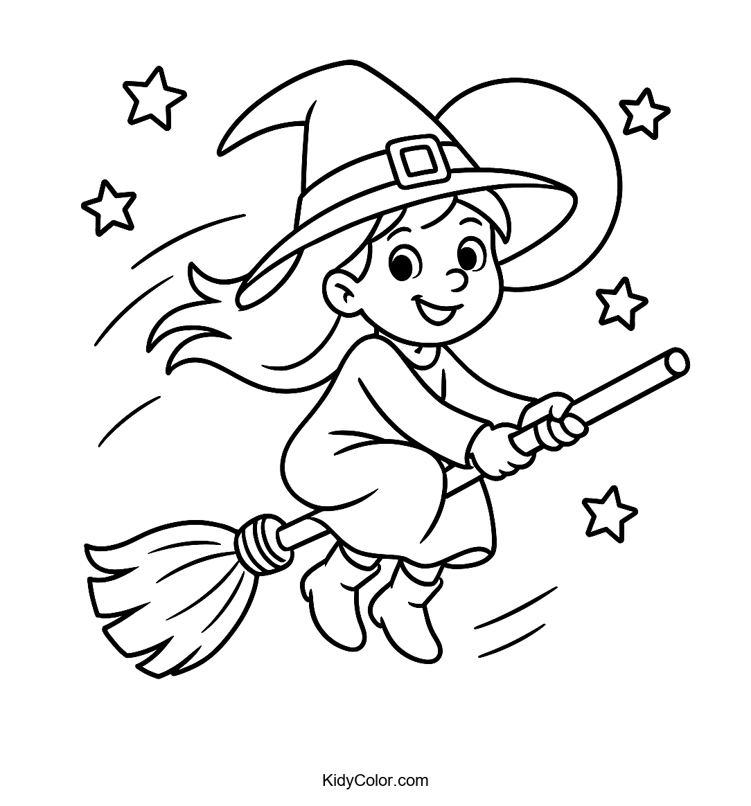 Discover the magical world of coloring with our "Witch in Flight Beneath the Moon" page, perfect for children who love Halloween and fantasy. Kids will enjoy bringing to life the mystical scene of a witch soaring across the moonlit sky, igniting their imaginations and creativity.