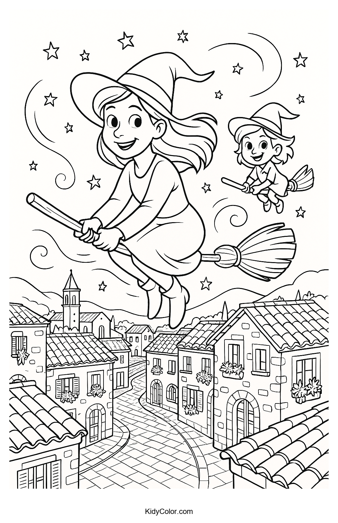 Dive into a magical adventure with this Witch-themed coloring page, featuring witches soaring above a charming Mediterranean village. Perfect for sparking creativity in young minds, this image offers a delightful blend of fantasy and culture for kids to color and enjoy.