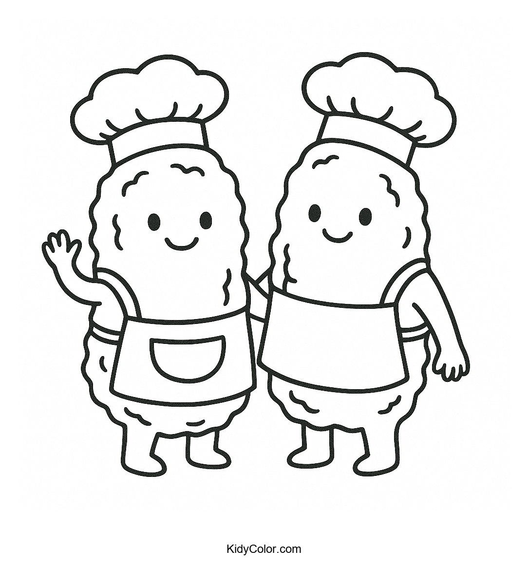 Dive into a fun-filled coloring adventure with the "Chefs of the Nugget Kind." This delightful coloring page depicts quirky nugget characters dressed as chefs, perfect for sparking your child's culinary creativity and color imagination.