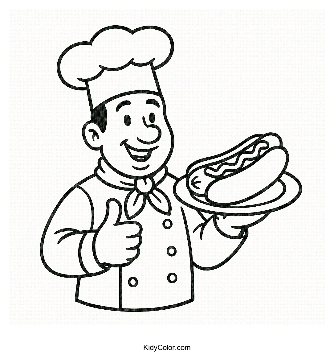 Delight your child with this exciting coloring page featuring a cheerful chef proudly holding a hot dog. Perfect for little artists, this page invites creativity while introducing kids to the world of cooking in a playful way.