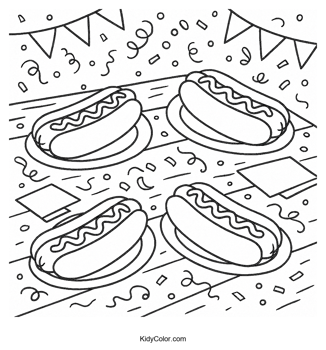 Discover a fun and festive coloring page featuring delicious hot dogs on a wooden table. Perfect for culinary-themed activities, this coloring page will spark creativity as kids add their own vibrant toppings to the hot dogs, making it an exciting draw-and-color experience.