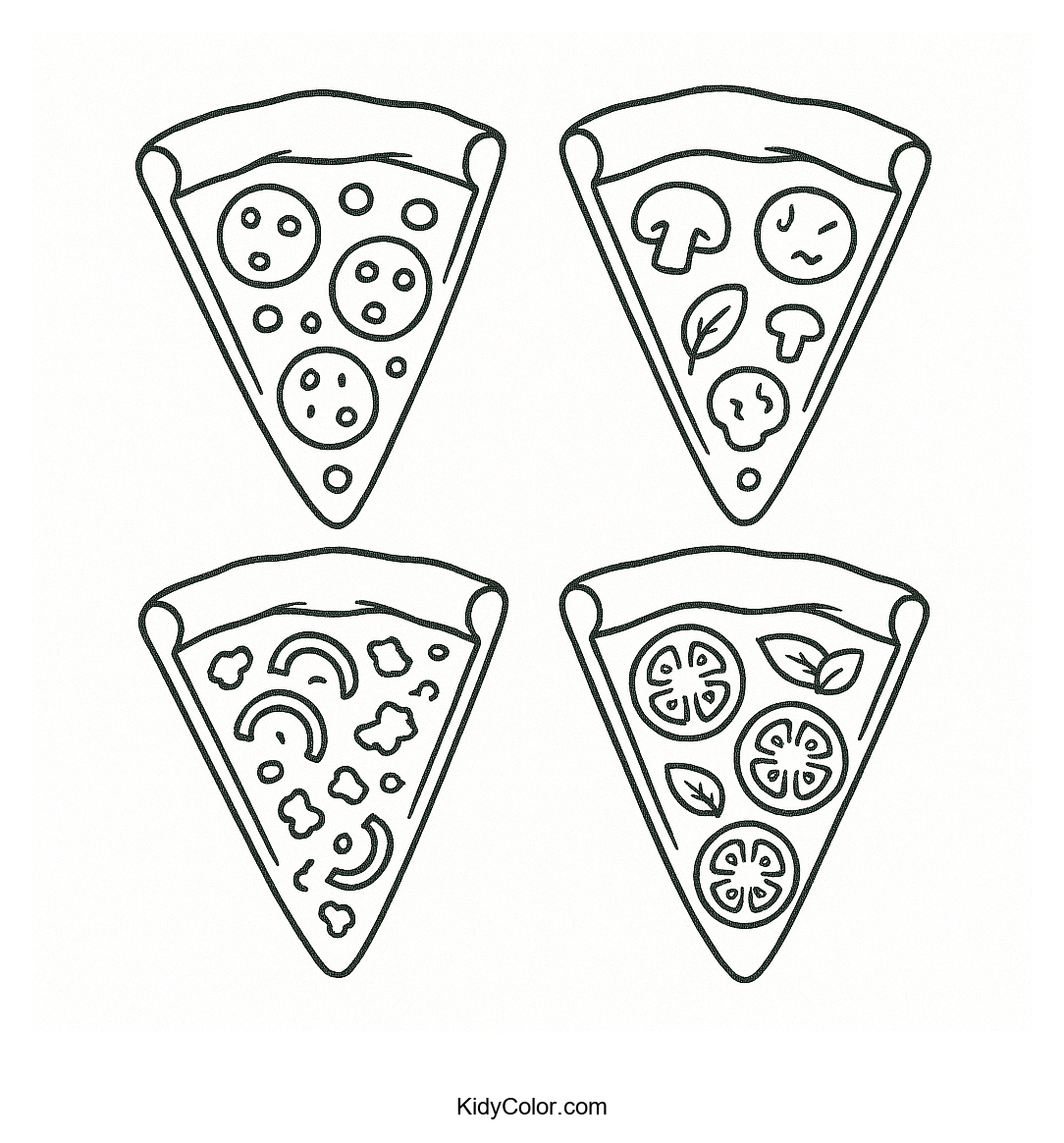 Delight your little ones with our deliciously fun pizza slices coloring page! This delightful coloring activity features four distinct pizza slices, each with unique toppings, ensuring hours of creative and colorful fun for your kids.