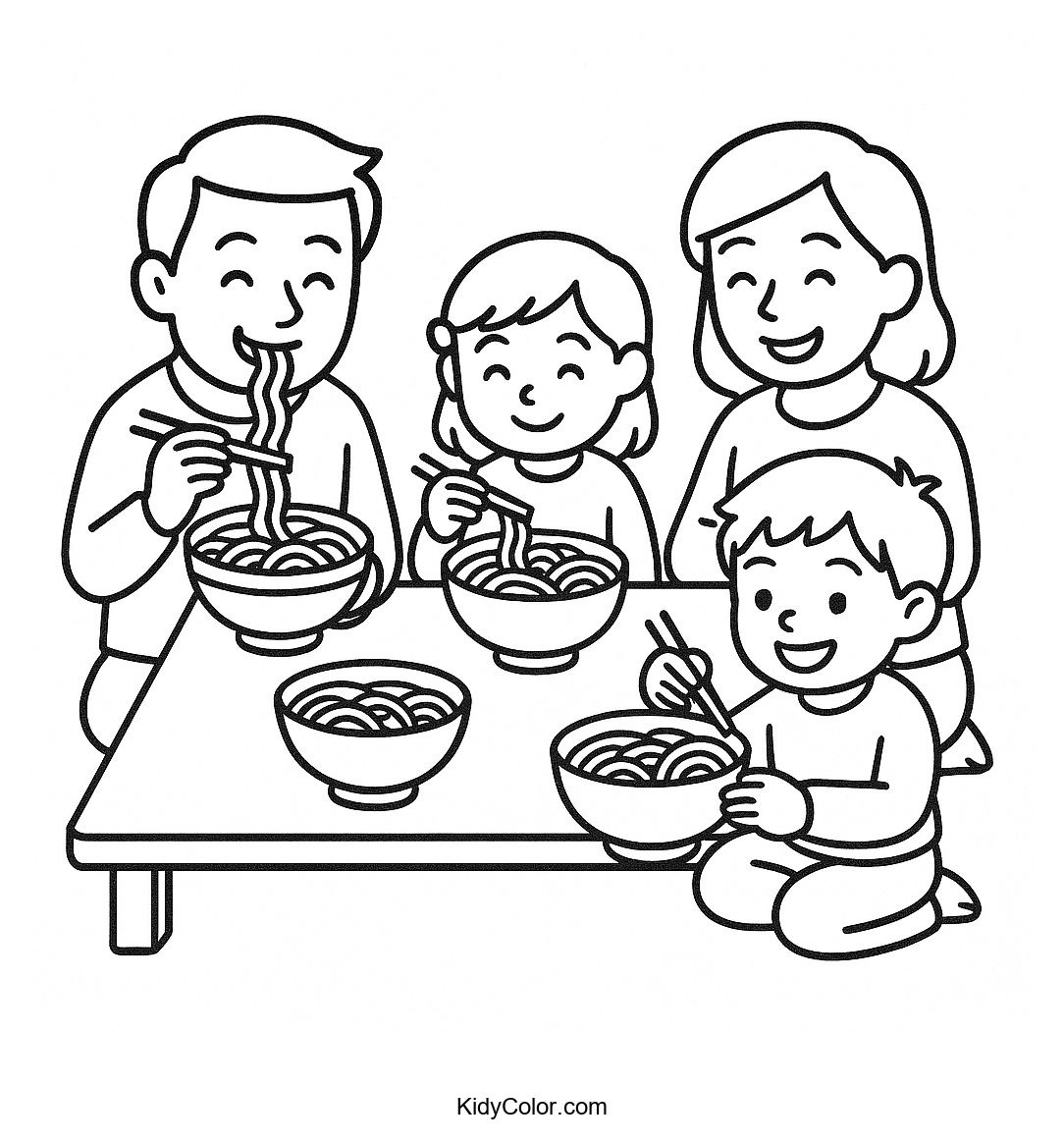 Delight in the charm of togetherness as your kids color this heartwarming image of a family sharing a ramen meal. Perfect for inspiring fun conversations about food and family time.
