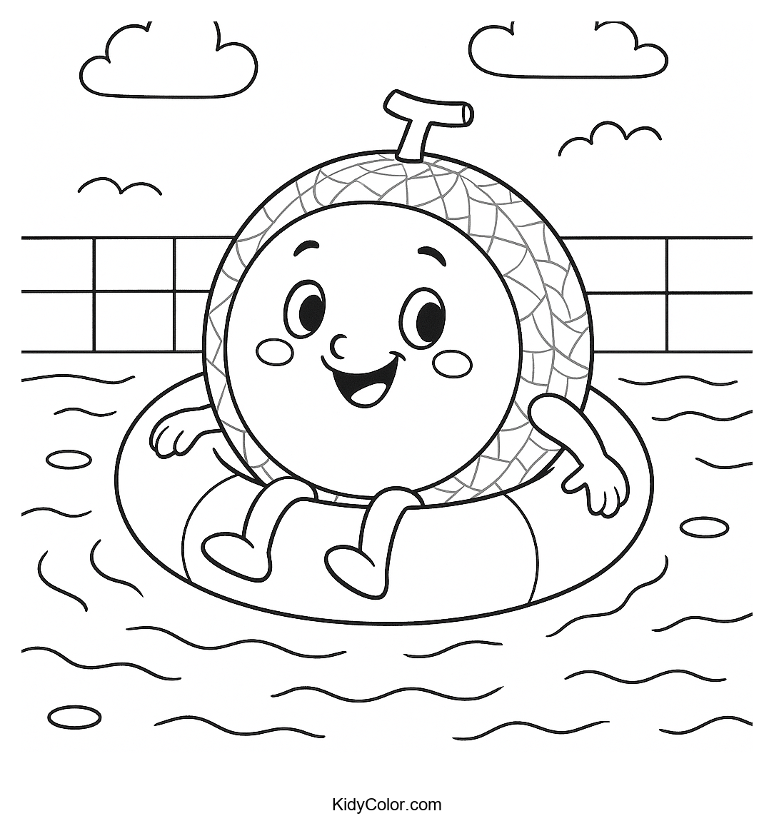 Dive into fun with this whimsical coloring page featuring a playful cantaloupe lounging in the pool. Perfect for sparking kids' creativity, this page invites little ones to add their favorite colors to a fruity summer scene.