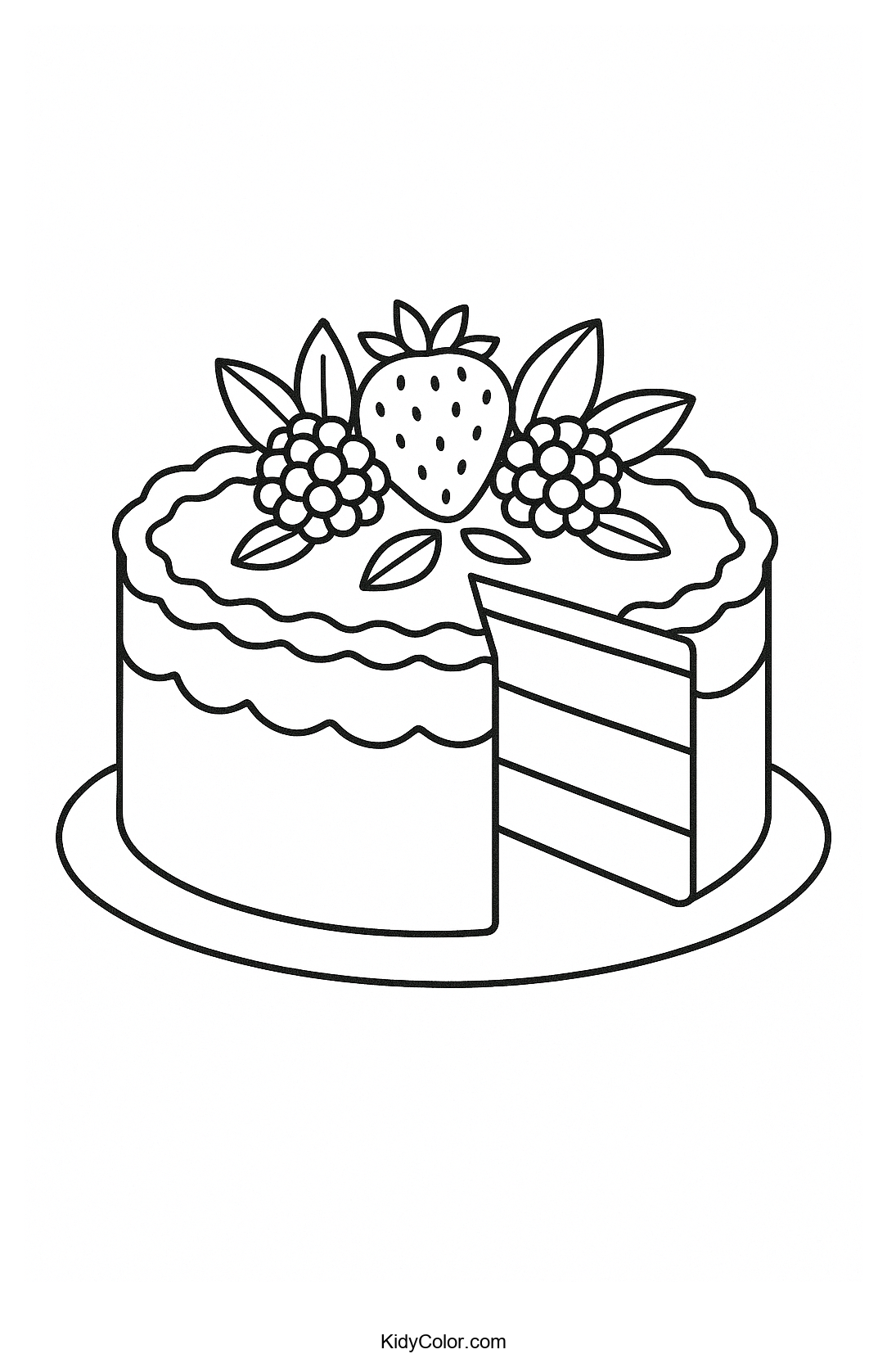 Delight in coloring this scrumptious layered cake adorned with a variety of fruits. Perfect for young artists who love desserts and creativity, this page offers a fun way to boost imagination and fine motor skills.
