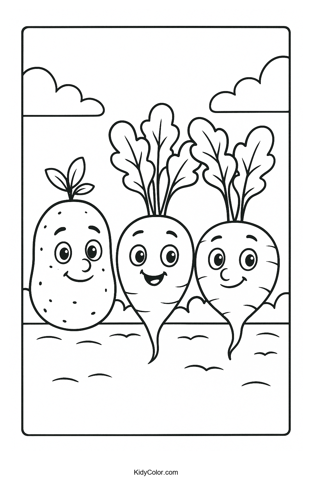 Delight your child's creativity with this charming coloring page featuring veggies growing in a happy garden row. Perfect for introducing kids to healthy eating while they have fun coloring diverse vegetables.