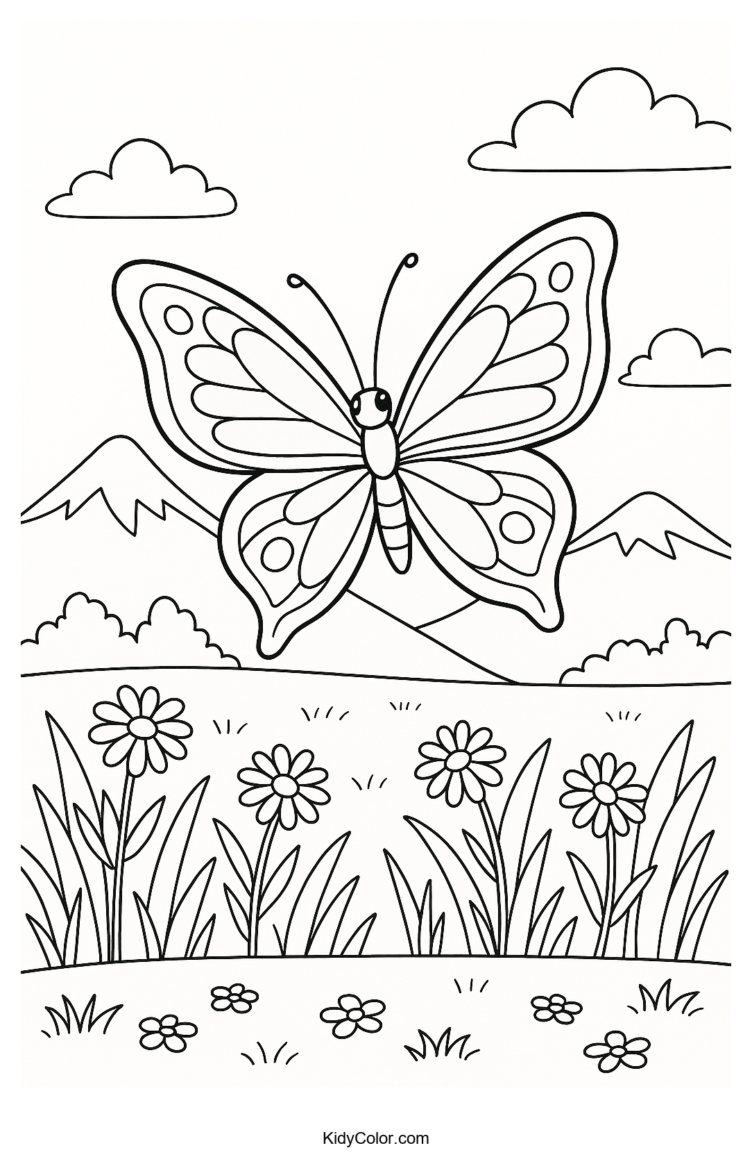 Discover a delightful coloring adventure with this "Butterfly Above Meadow and Mountains" page. Perfect for kids who love nature, this scene features a graceful butterfly soaring above a serene meadow with majestic mountains in the background, sparking creativity and joy in young artists.