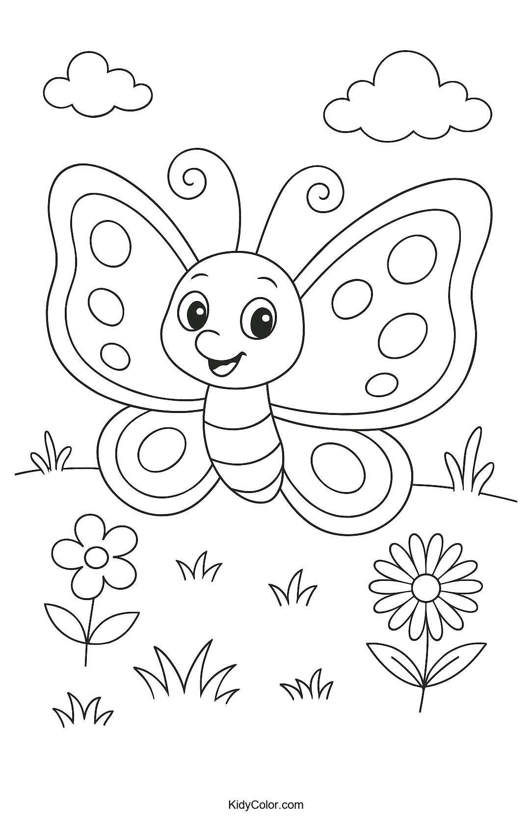 Discover an enchanting coloring page featuring a whimsical cartoon butterfly fluttering among clouds and flowers. Perfect for sparking creativity, your child will love bringing this cheerful scene to life with their favorite colors!