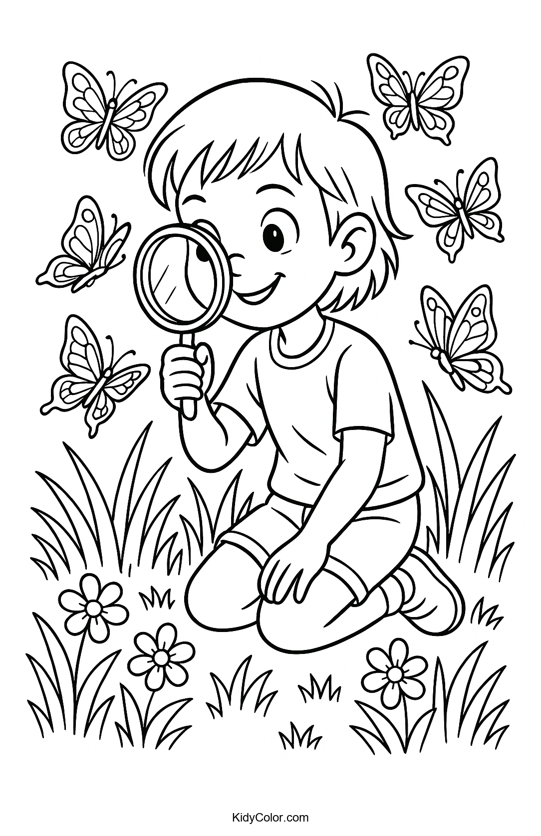 Discover the magic of nature with this enchanting coloring page of a little girl observing butterflies in a meadow full of flowers. Perfect for igniting creativity and teaching kids about the wonders of nature.