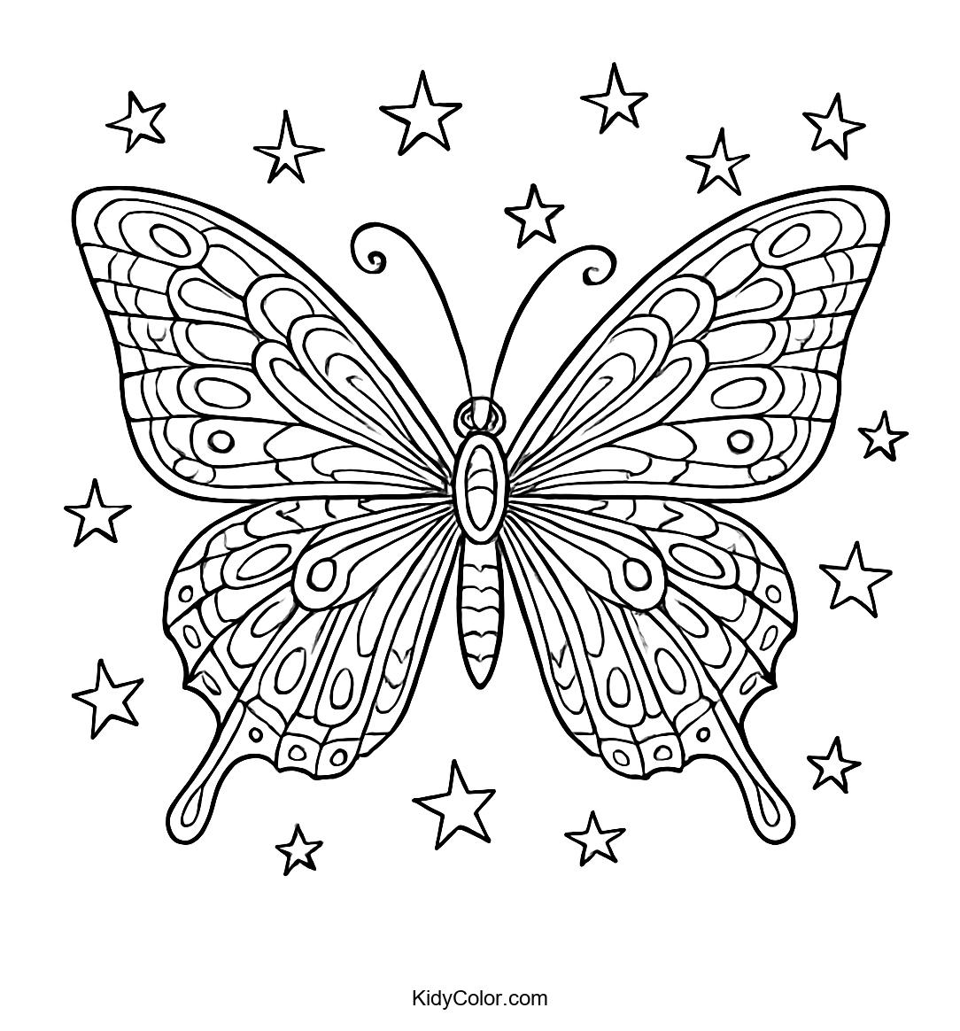 Discover the magic of symmetry with our Stellar Butterfly coloring page, featuring a beautifully patterned butterfly surrounded by stars. Perfect for young artists, this page will inspire creativity and focus as children explore colors and patterns.