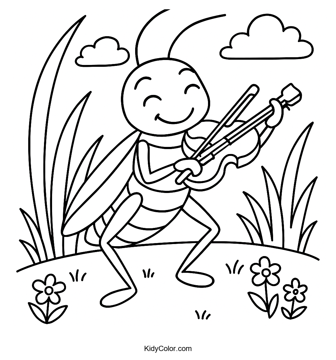 Delight young artists with this adorable coloring page featuring a joyful grasshopper playing the violin outdoors. Perfect for kids, this scene encourages creativity and helps develop fine motor skills as they explore colors for a lively musical scene.