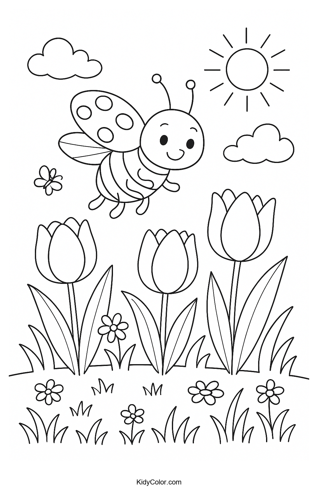 Delight your child's creativity with our charming coloring page featuring a ladybug perched above vibrant blooming tulips. Perfect for young nature enthusiasts, this page encourages fine motor skills and a love for nature as they add their favorite colors to this springtime scene.