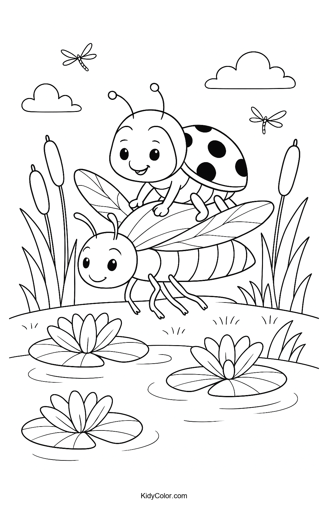 Discover the fun of coloring with this charming scene featuring a ladybug and a dragonfly by the pond. Perfect for sparking creativity and learning about nature, this coloring page will provide hours of entertainment for your little ones.