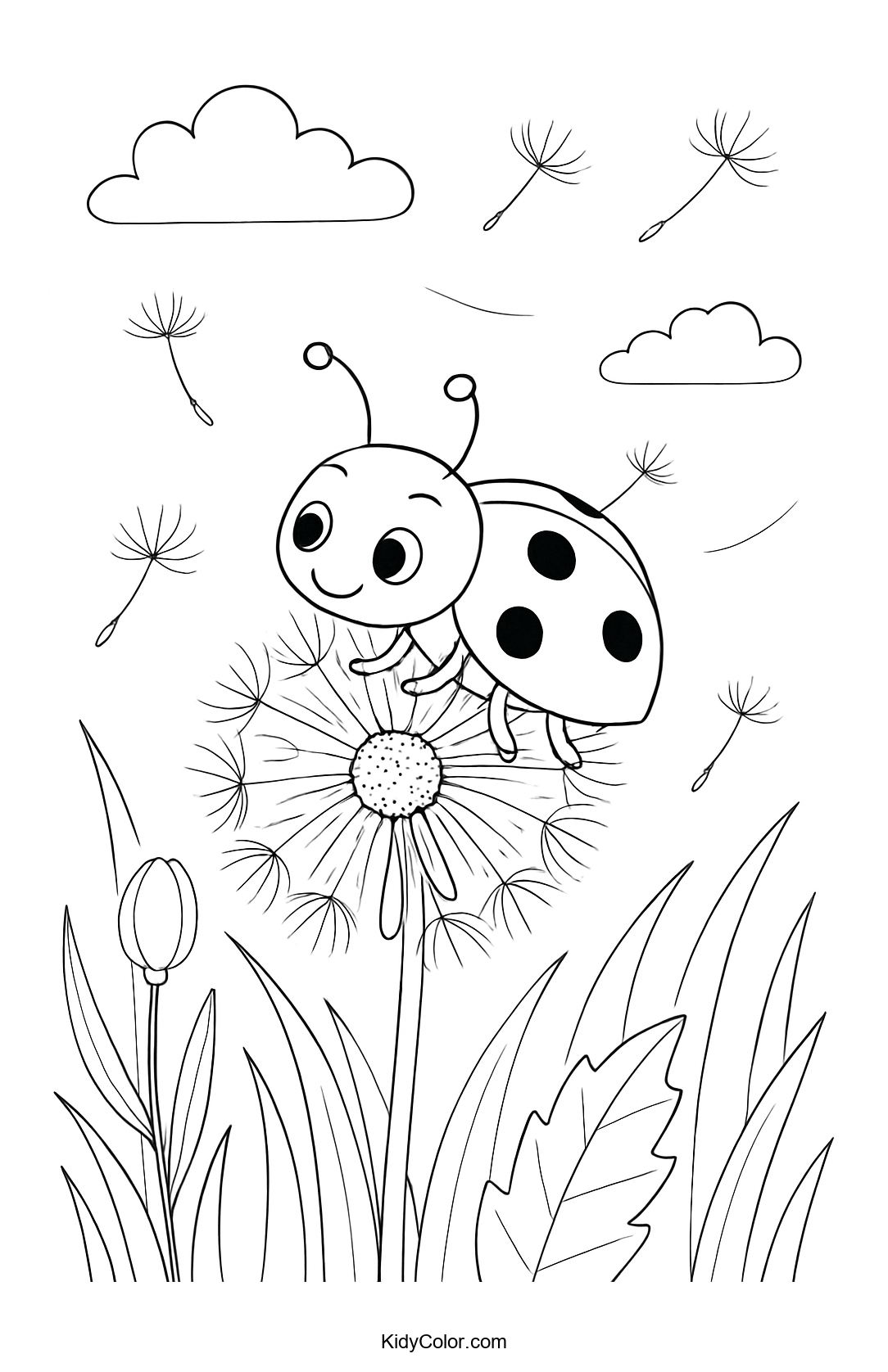Explore the delight of nature with this charming coloring page featuring a ladybug perched on a dandelion seed head. Perfect for young artists, this page encourages creativity and helps kids learn about the beauty of insects and plants while having fun.