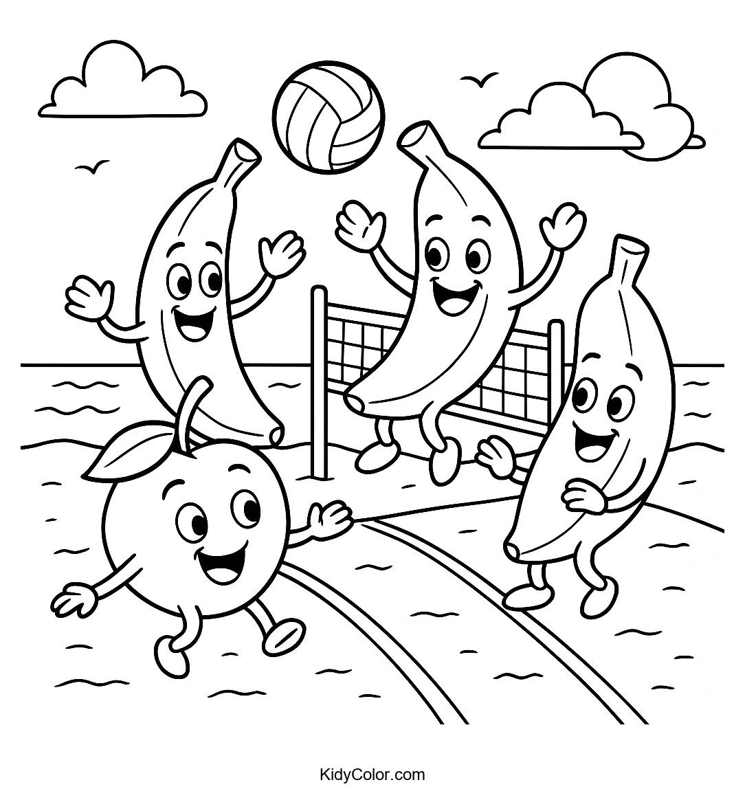 Dive into a world of fruity fun with this delightful coloring page featuring charming bananas playing an exciting game of beach volleyball. Perfect for kids who love sports and being creative, this page encourages imaginative play and vibrant coloring.