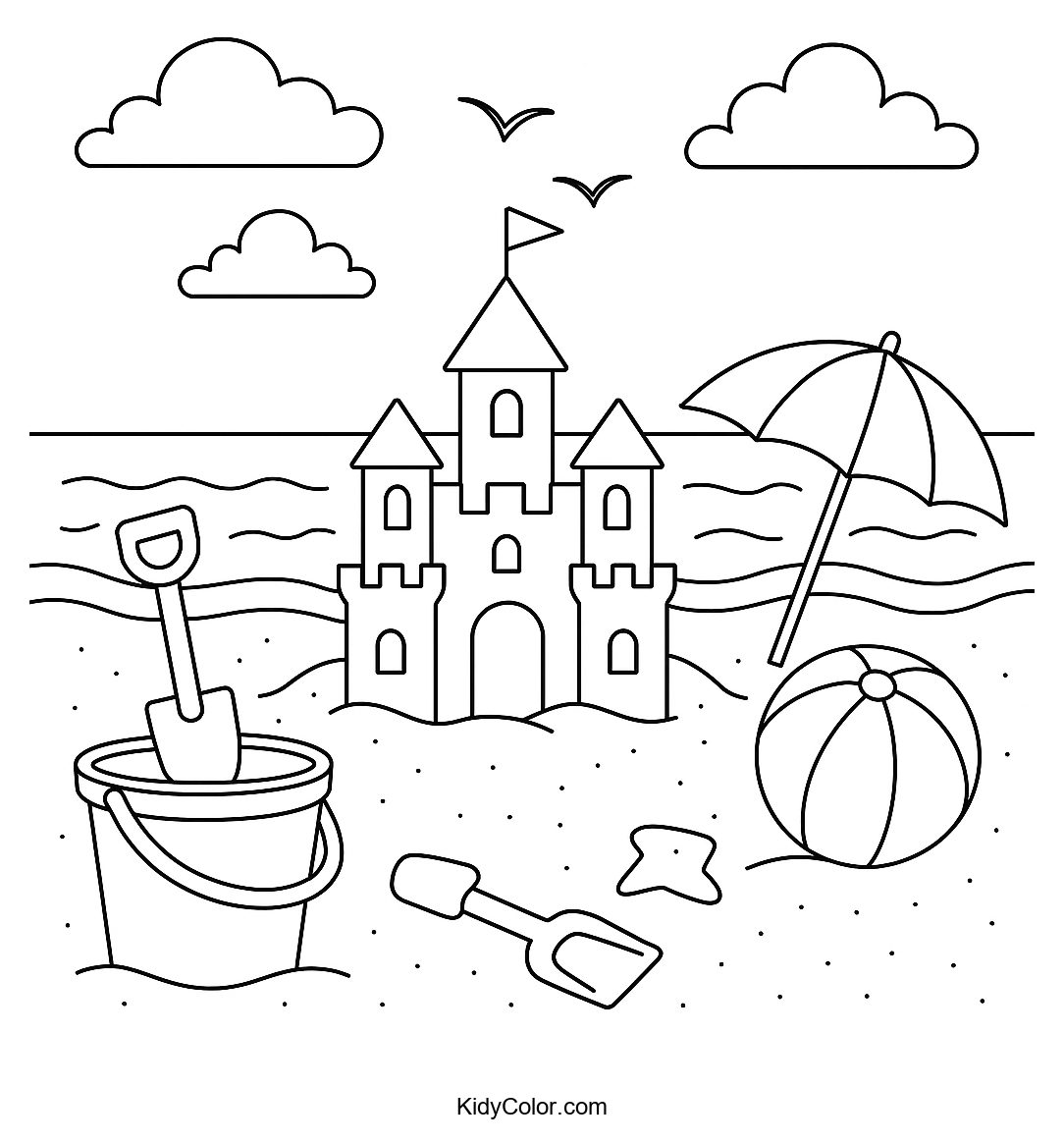 Discover a fun-filled coloring page featuring a playful beach day scene with a sandcastle and beach toys. Perfect for sparking creativity, this image will delight kids as they color sunny skies and seashores.