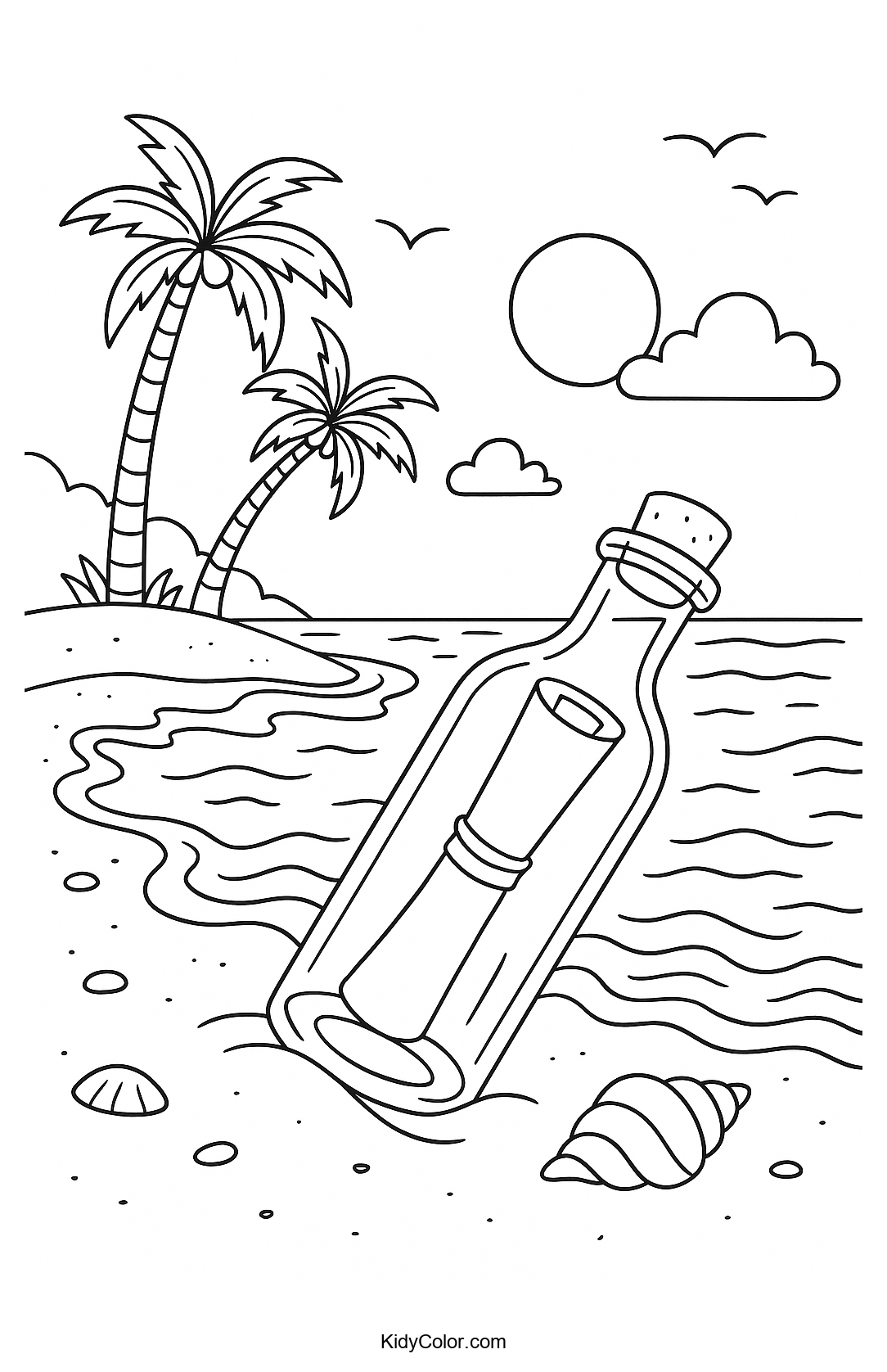 Dive into a seaside adventure with this 'Message in a Bottle by the Beach' coloring page. Ideal for sparking creative storytelling, kids will love bringing this mysterious beach scene to life with colors.