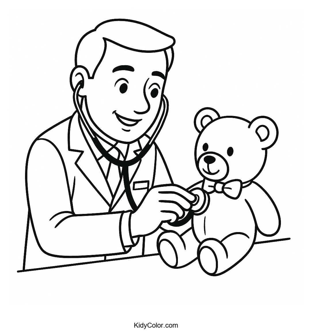 This delightful coloring page features a friendly doctor giving a cute teddy bear a fun check-up. Perfect for aspiring young doctors, this scene will spark creativity as kids color the joyful interaction between the doctor and their plush patient.