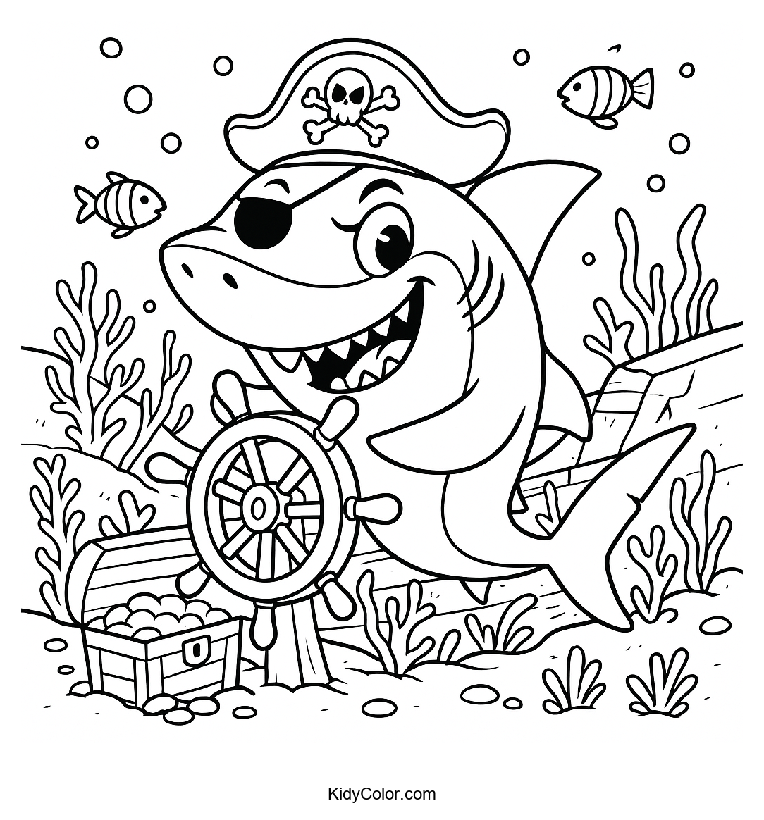 Dive into an ocean adventure with this coloring page featuring a playful pirate shark swimming around a sunken treasure chest. Perfect for sparking creativity, kids will love bringing this underwater scene to life with their favorite colors.