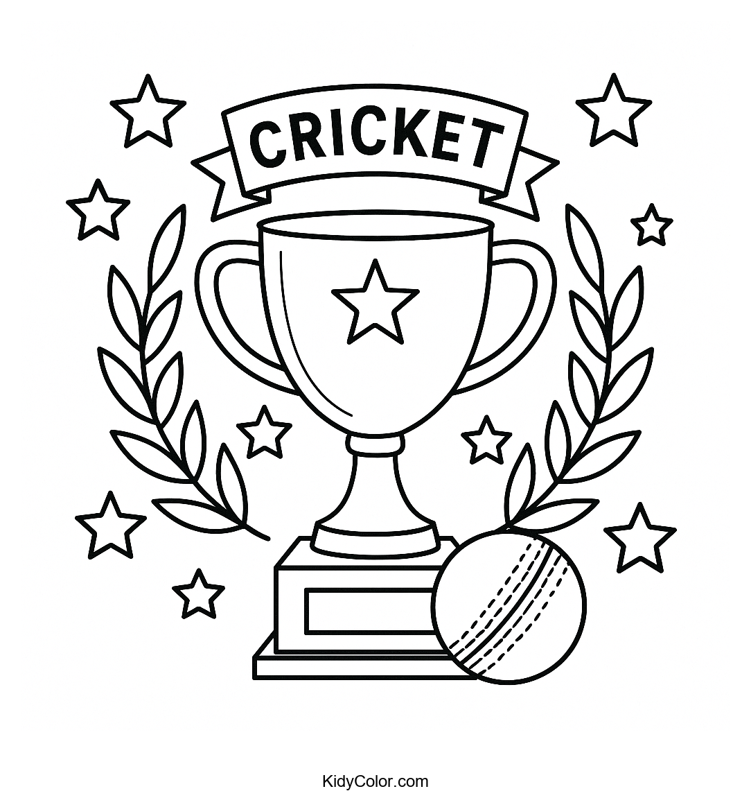 Kids will enjoy coloring this cricket trophy adorned with laurel wreaths and stars, perfect for little sports enthusiasts. Parents can encourage creativity and fine motor skills with this engaging cricket-themed coloring activity.