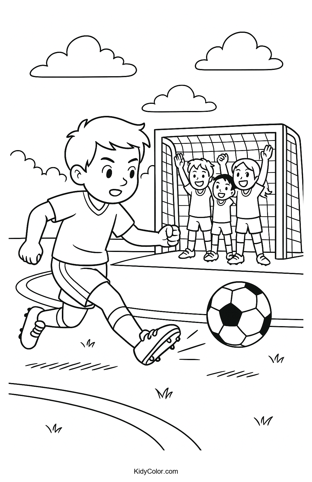 Dive into the thrilling world of soccer with this action-packed coloring page, featuring a dynamic goal-scoring moment that young sports enthusiasts will love bringing to life with their favorite colors. Perfect for kids who enjoy sports and creativity.