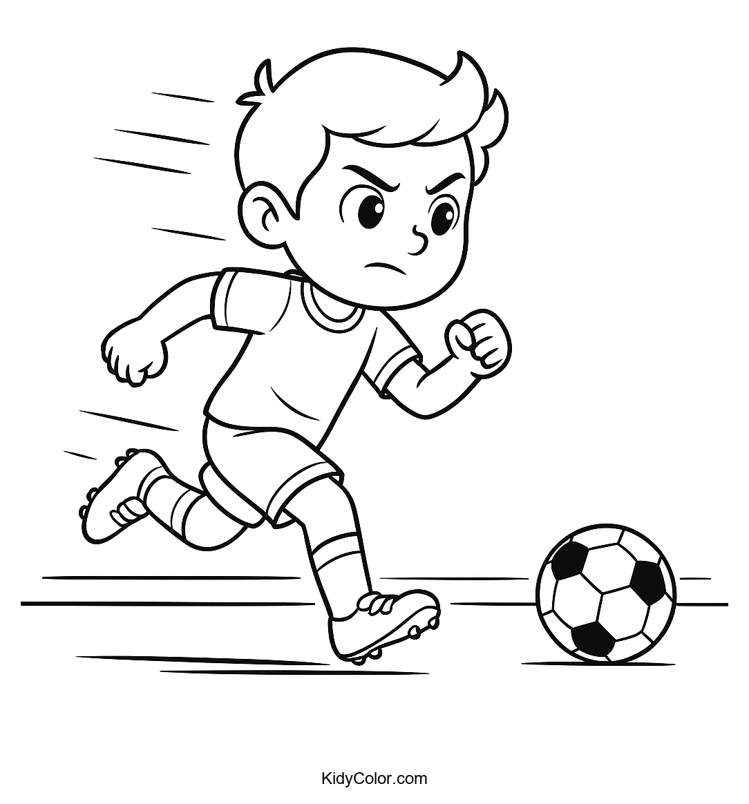 This exciting coloring page features a young soccer player caught in action on the field. Perfect for kids who love sports, this page encourages creativity and helps develop fine motor skills while they bring this dynamic scene to life.