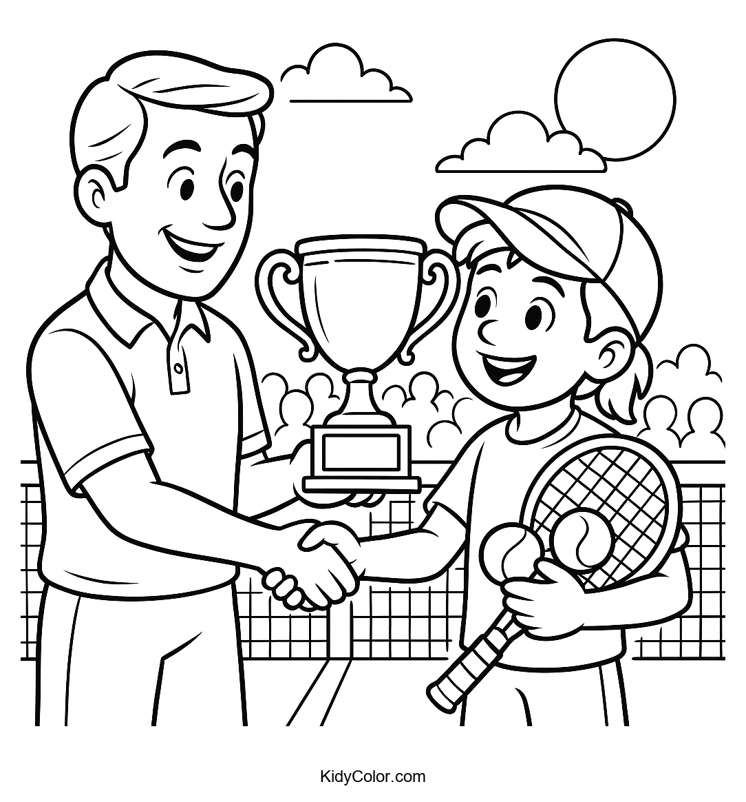 Celebrate sportsmanship and victory with this Tennis Trophy Presentation Ceremony coloring page. Perfect for young sports fans, this page invites kids to color an exciting award scene, sparking creativity and fun while learning about tennis.