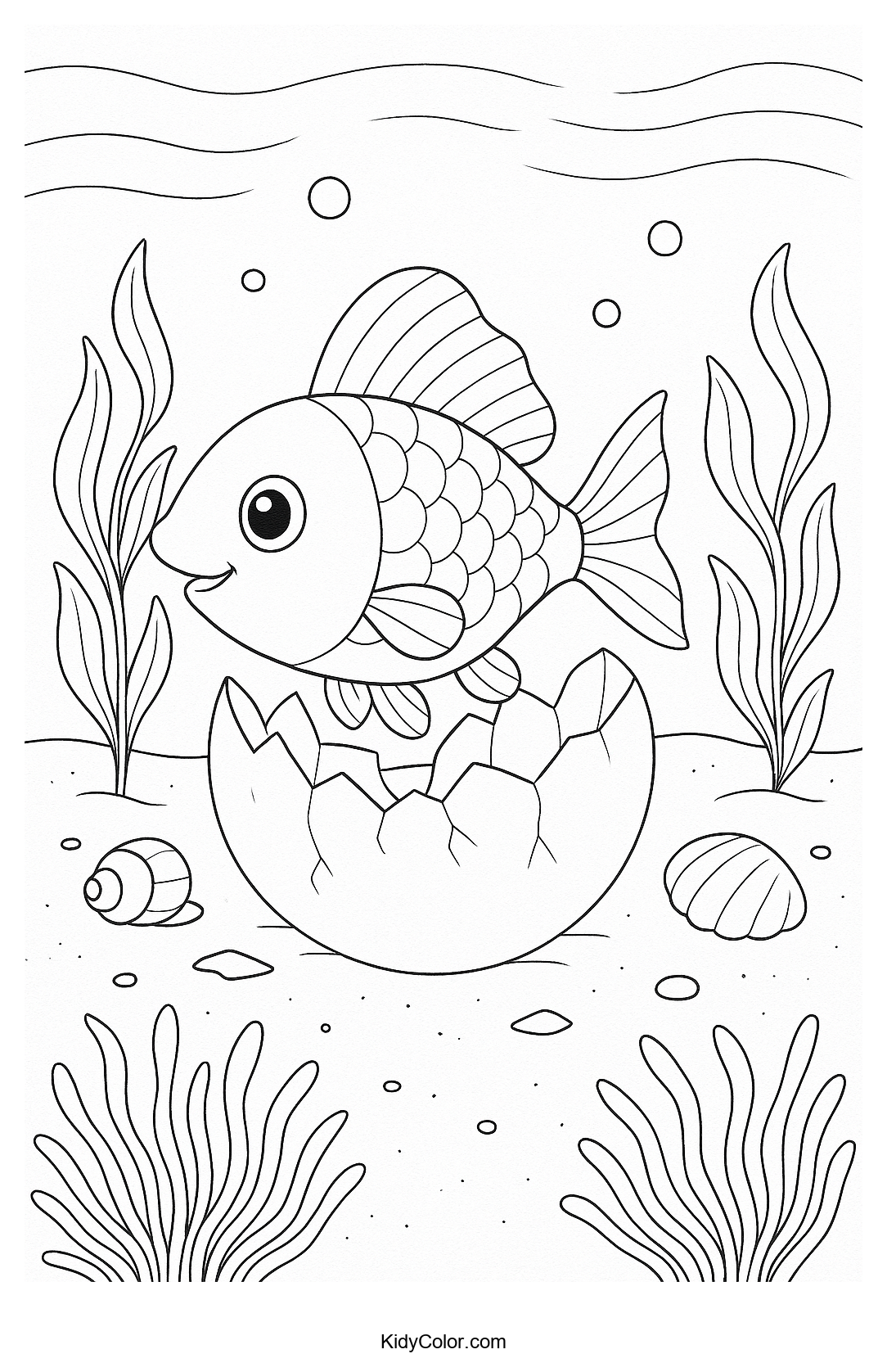 Delight your child's creativity with our Happy Fish Emerging from Egg coloring page. Perfect for little ocean lovers, this playful scene will spark their imagination and provide hours of coloring fun.