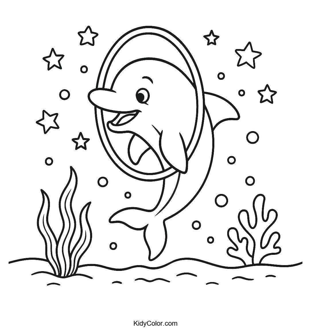 Dive into fun with this delightful coloring page featuring a playful dolphin leaping through a hoop underwater. Perfect for engaging children who love marine life and enjoy adding vibrant colors to create their own ocean adventure.