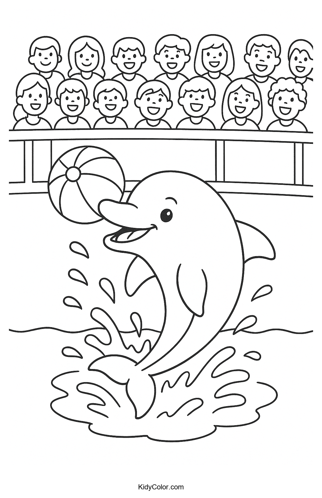 Dive into creativity with this captivating dolphin show coloring page! Kids will enjoy bringing to life a playful dolphin performing amazing tricks while an enthusiastic crowd cheers them on. Perfect for engaging young imaginations and refining their coloring skills!