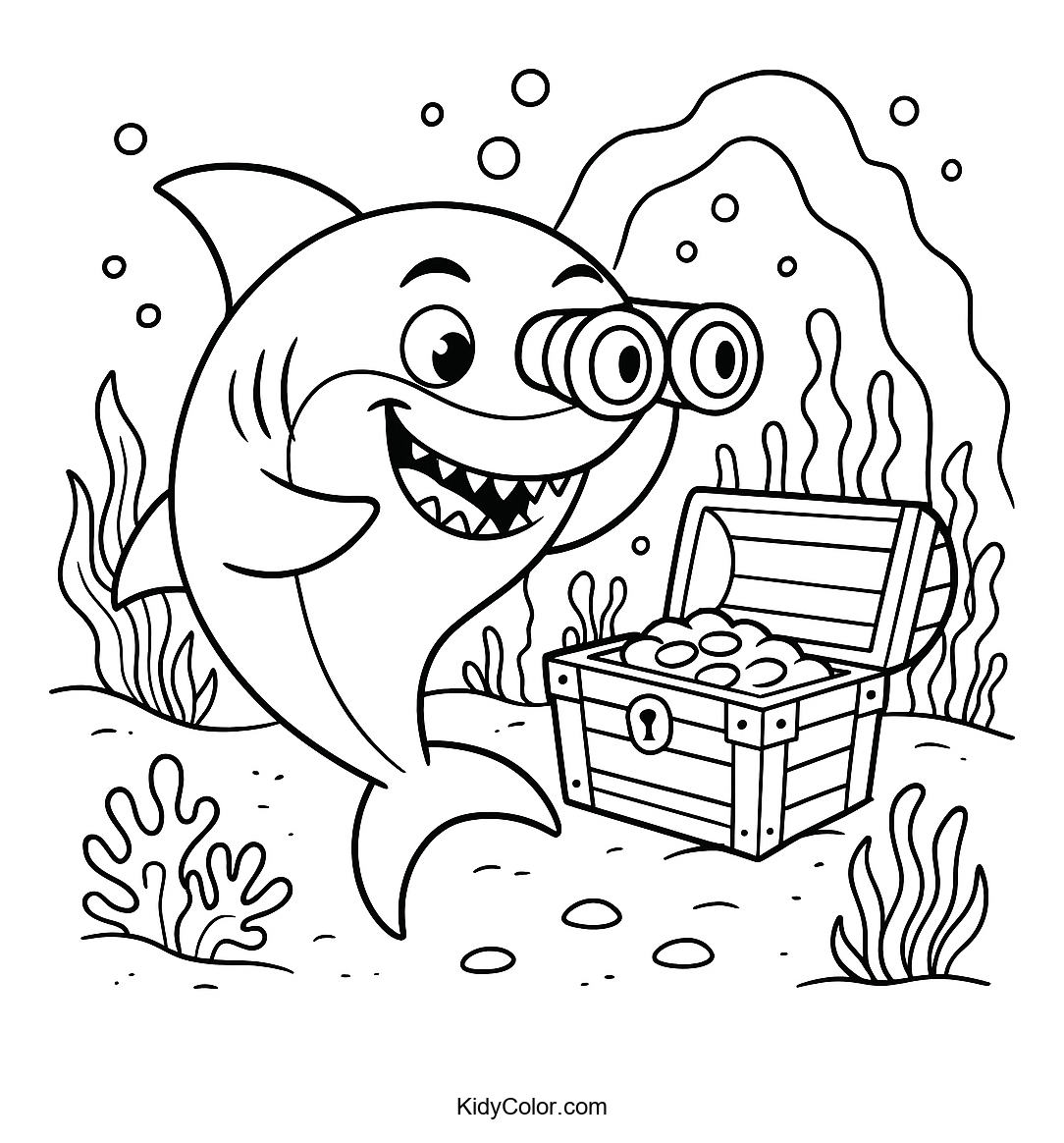Dive into a sea adventure with this fun coloring page featuring a friendly cartoon shark and a treasure chest. Perfect for sparking kids' imagination and creativity, this page will keep them entertained as they bring this underwater scene to life.