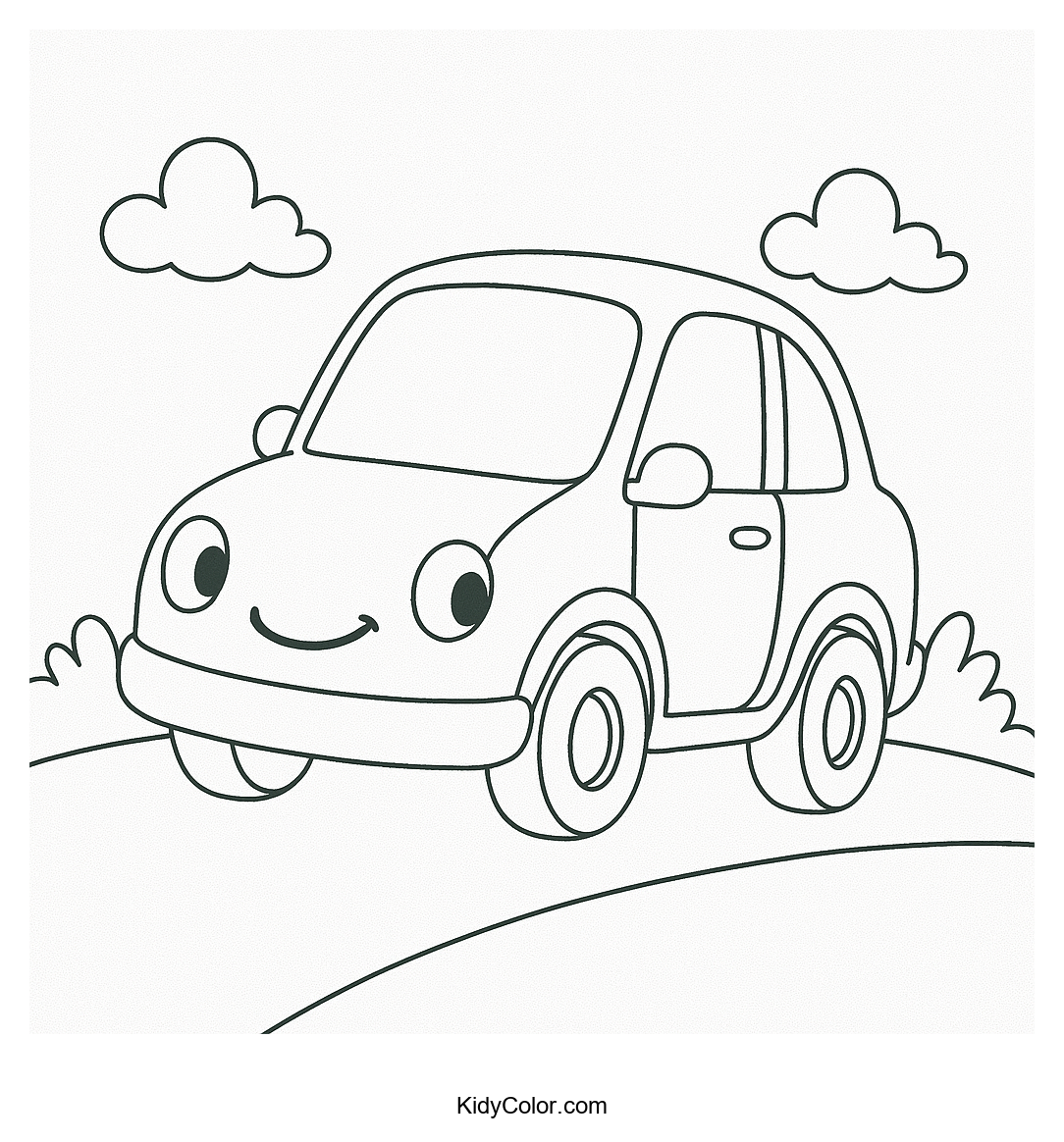 This engaging coloring page features a whimsical cartoon car zooming down a winding road, perfect for sparking children's creativity and motor skills. Kids will love adding their unique touch to bring this lively scene to life.
