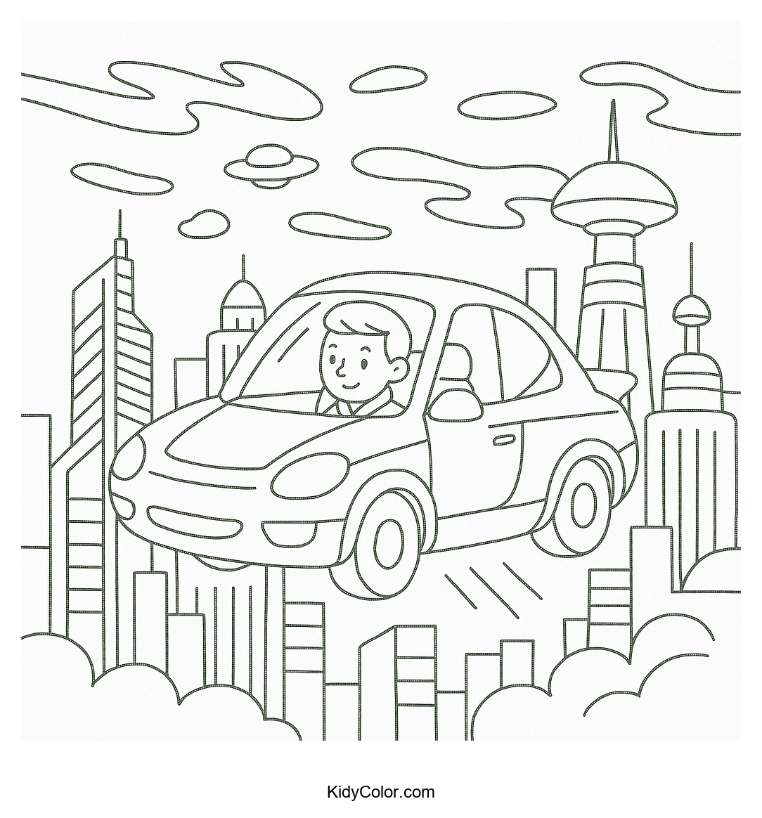 Explore imagination and creativity with this sci-fi coloring page featuring a futuristic hover car zooming through a vibrant sci-fi cityscape. Perfect for kids who love futuristic adventures and coloring their own high-tech scenes.