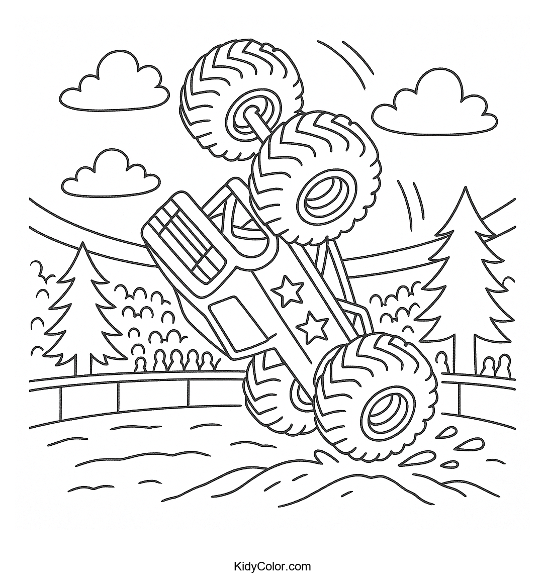 Let your child's imagination soar with our Monster Truck Backflip in Stadium coloring page. Perfect for young fans of thrilling monster truck events, this scene captures the excitement of a high-flying truck in mid-backflip, surrounded by a cheering crowd.
