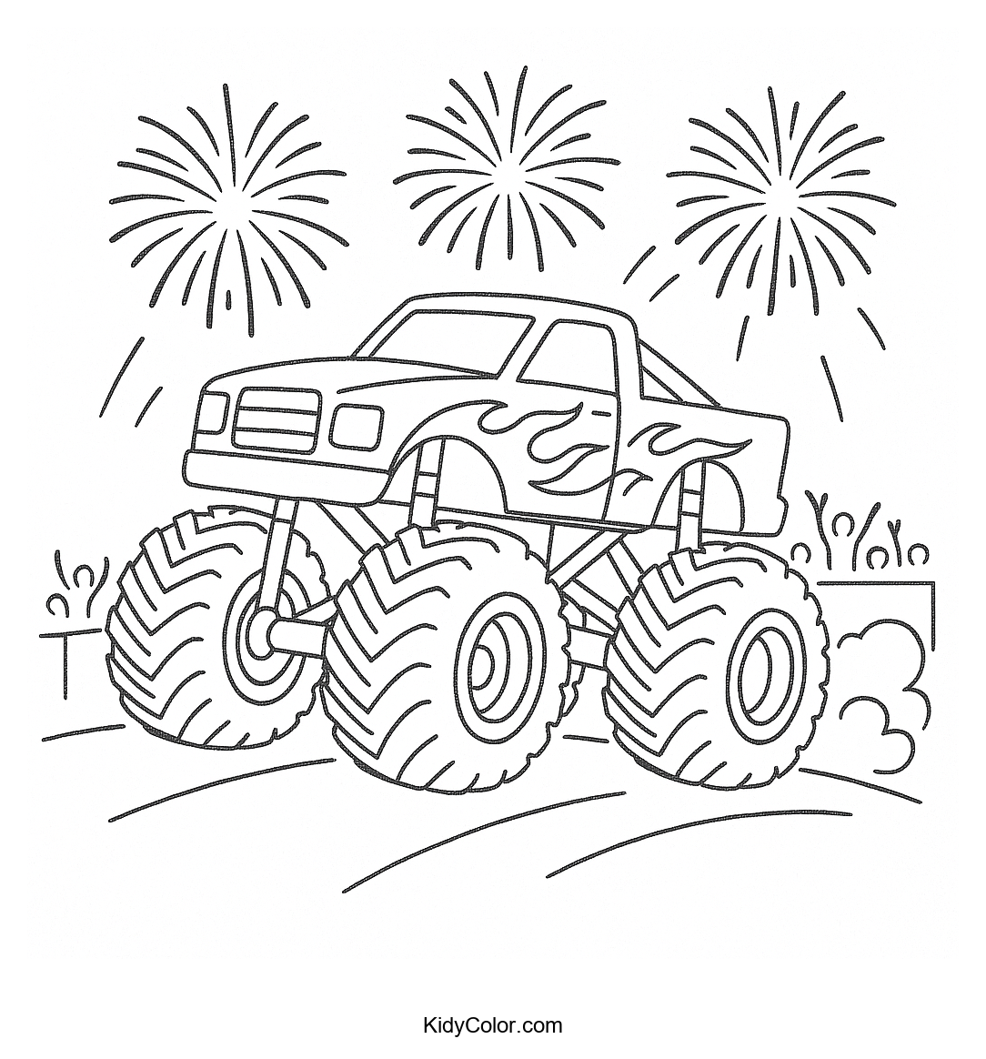 This exciting coloring page features a thrilling monster truck show under a sky bursting with fireworks. Perfect for kids who love adventure and action, this scene offers an engaging way to explore their creativity and color the night sky and powerful trucks.