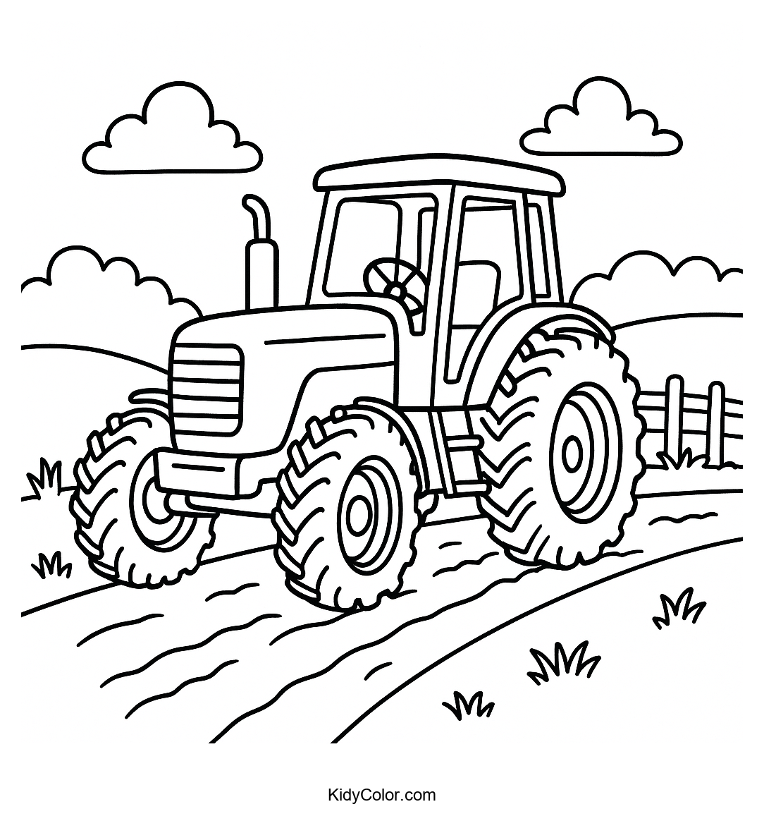 Engage your child with our delightful coloring page featuring a vibrant tractor driving down a picturesque countryside road. Perfect for sparking creativity and teaching the beauty of nature.