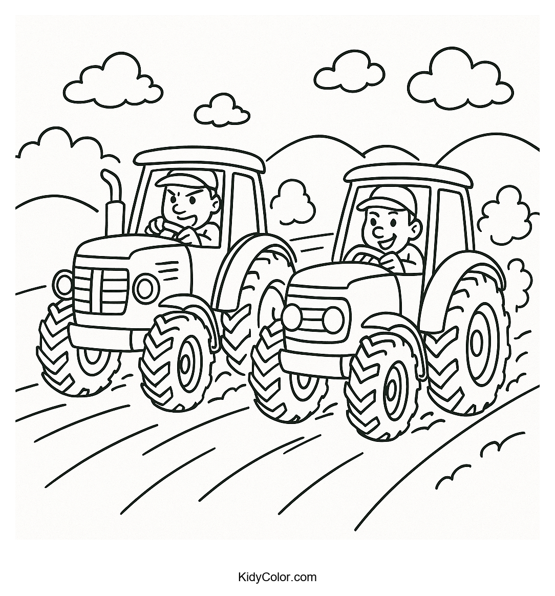 This engaging coloring page features a thrilling tractor race on a dusty road, perfect for young racing enthusiasts. Children will love adding vibrant colors to the scene and bringing the excitement of the race to life!