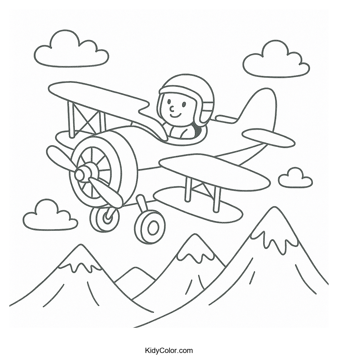 Let your child's imagination take flight with this vintage biplane coloring page! Featuring a classic aircraft soaring over majestic mountain peaks, it’s perfect for young aviation enthusiasts and offers a fun way to learn about history while coloring.